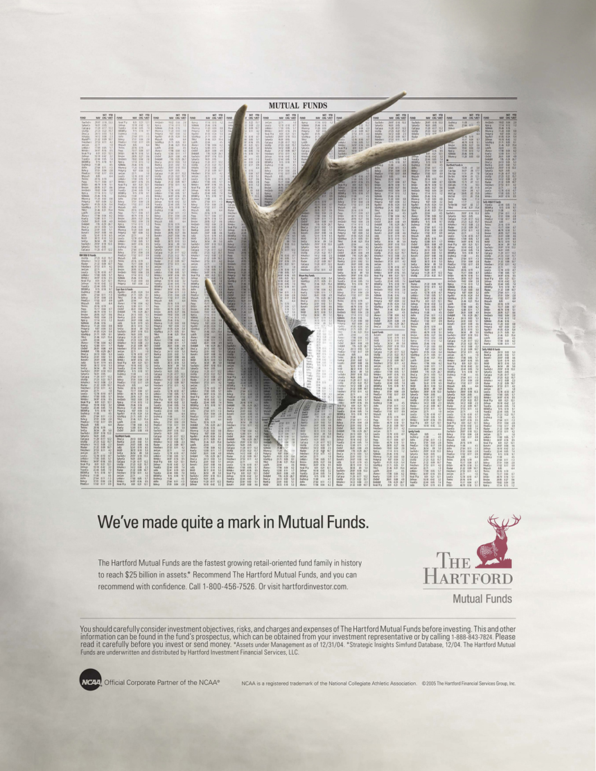 National Television ad shot entirely in the New York Stock Exchange in NYC. This TV spot was part of an ad campaign to promote The Hartford Mutual Funds. The Hartford Stag was created in post production.